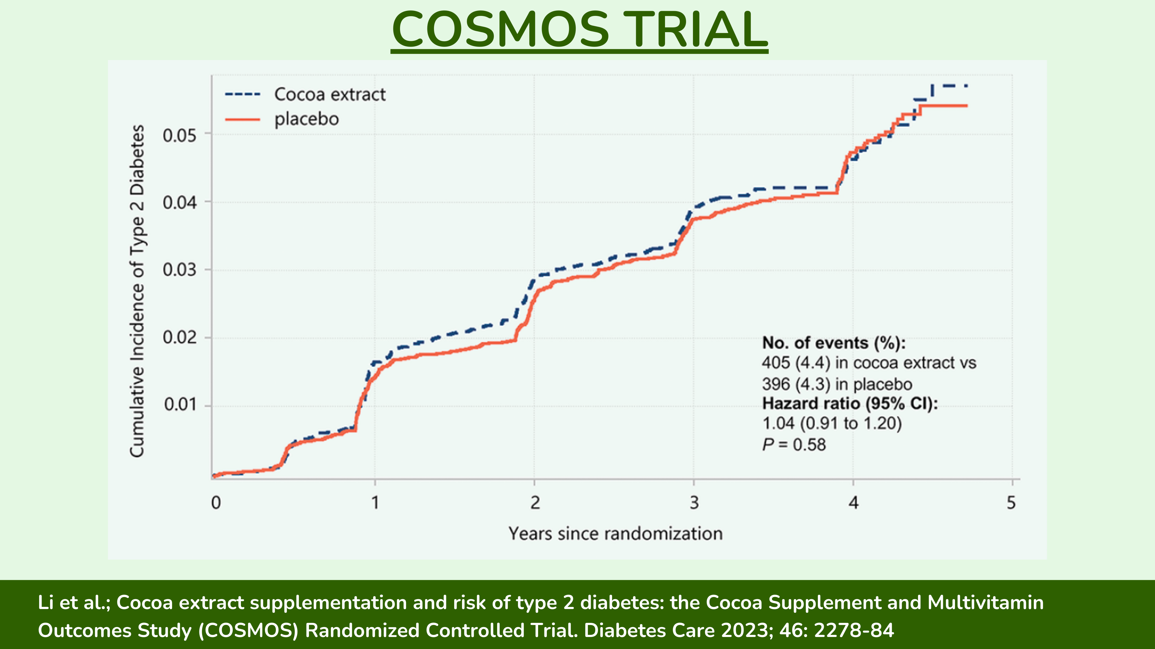 最后,我们确实有一项长期随机对照试验的数据,该试验中,参与者每天服用一粒含有分离的可可黄烷醇的药丸或安慰剂药丸。这项研究被称为COSMOS 试验,其中包括 18,381 名基线时没有患糖尿病的老年男性和女性,并进行了三年半的随访。这项研究的结果是 2 型糖尿病的发展。