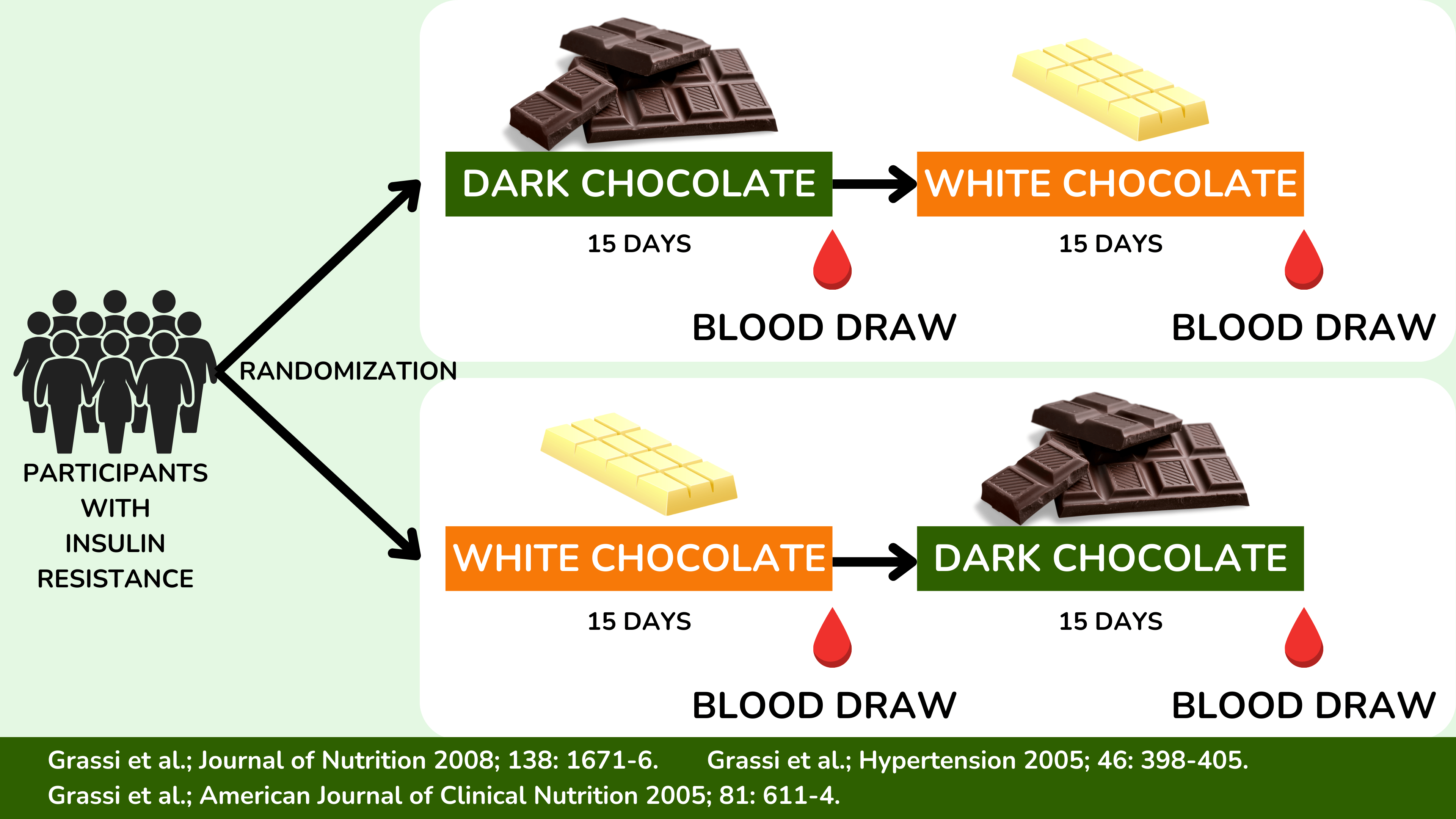 在这三项研究中(Grassi 等人;高血压 2005;Grassi 等人;美国临床营养杂志 2005;Grassi 等人;营养杂志 2008),胰岛素抵抗患者被随机分为两组。第一组首先在正常饮食的同时,每天食用一块黑巧克力,连续 15 天。经过一段短暂的洗脱期,这期间不食用任何巧克力,然后食用一块热量相同的白巧克力,连续 15 天。在每个阶段结束时空腹血液测量胰岛素抵抗(见上图)。第二组也完成了两个阶段,但顺序相反,称之为随机对照交叉设计,这是一个特别强大的研究设计,因为可以比较每个人在一种饮食下的胰岛素抵抗与另一种饮食下的胰岛素抵抗。由于人们是随机分组的,可以确保每个人在黑巧克力阶段都食用了黑巧克力,而不仅仅是那些拥有健康生活方式的人,就像上面讨论的观察性研究中的情况一样。