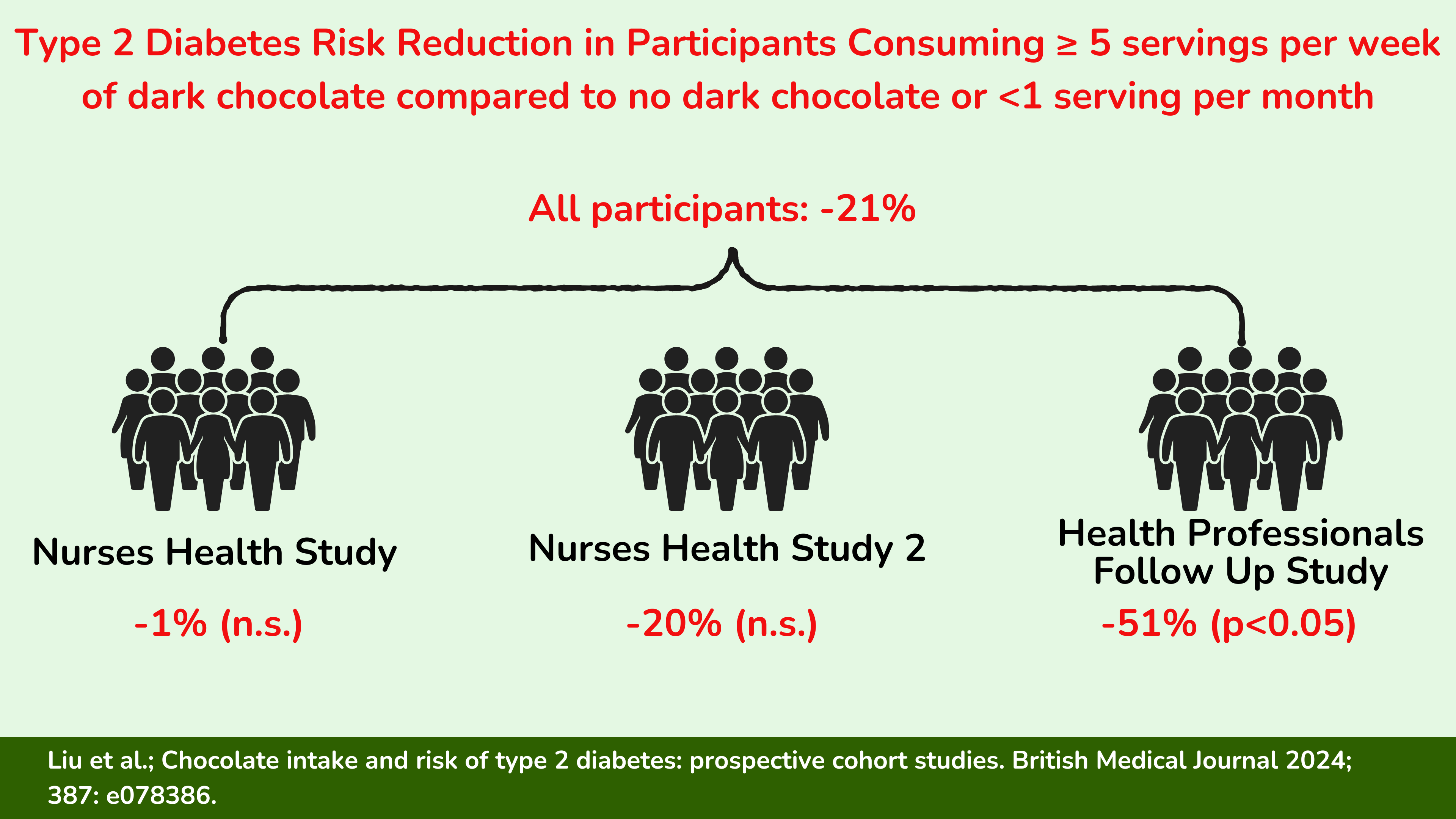 上个月初,一篇基于三个大型队列的新论文发表:护士健康研究、护士健康研究 2 和健康专业人员随访研究。总体而言,拥有来自这三个队列的 111,654 名参与者的数据。这些参与者在基线时均未患糖尿病,进行了 40 多年的观察。在此期间,每四年评估一次饮食摄入量和其他生活方式因素。该分析调查了巧克力消费是否与随访期间患 2 型糖尿病的风险有关。这是一项令人印象深刻的研究:规模非常大、随访时间非常长,反复评估饮食摄入量。